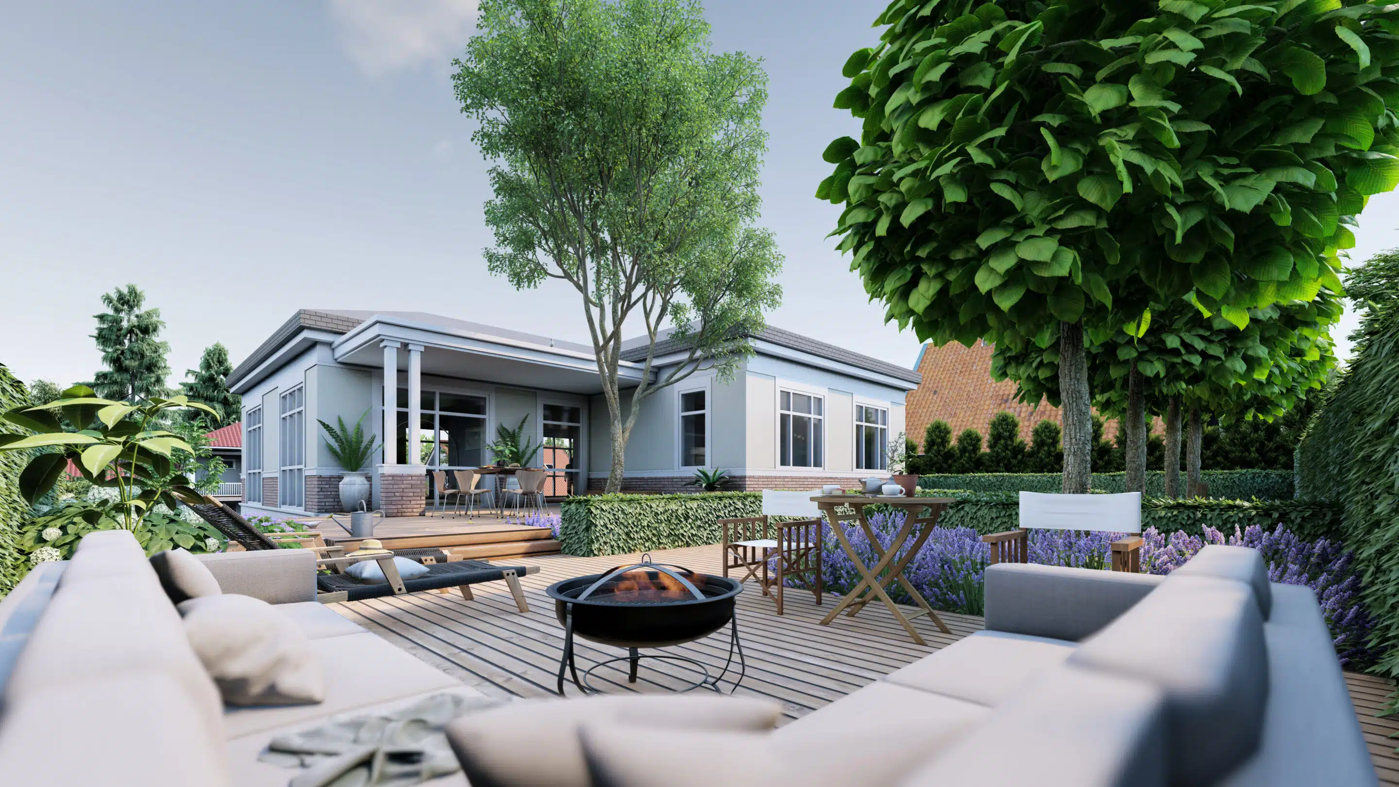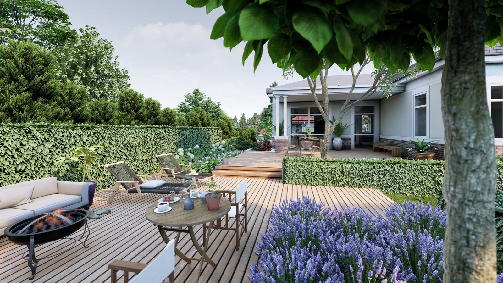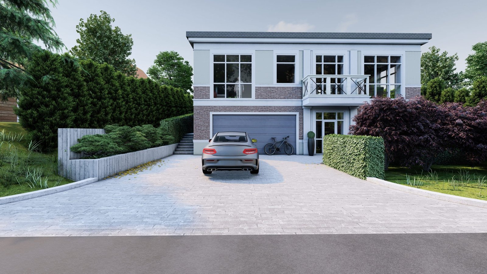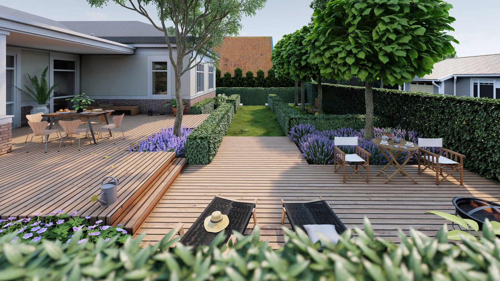 Sklype yra virš 3,5 metrų aukščių perkritimas. Sklypo panaudojimui optimizuoti erdvė buvo suskirstyta į tris pagrindines zonas. Priekinė (plokščia zona / parkingas), vidurinė (šlaitas / perėjimas) ir galinė zona (laisvalaikis). Dvi terasos, atskirtos vieno laipto pakopa, suteikia patogią erdvę pietauti arba ilsėtis ant minkštasuolio prie ugniakuro. Žalioje zonoje dešinėje viršuje galima pasivaikščioti basomis žole tarp vaismedžių ir vaiskrūmių, atskirtų žemomis gyvatvorėmis.